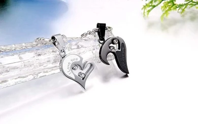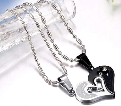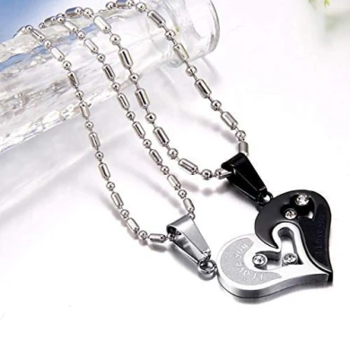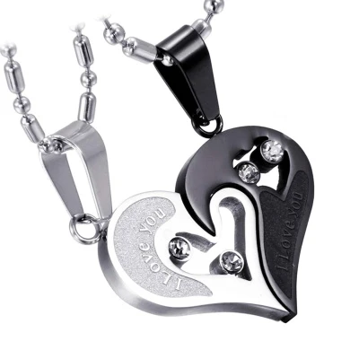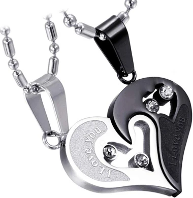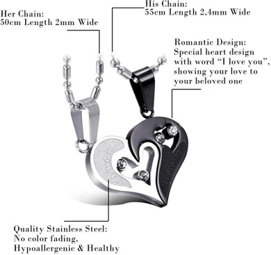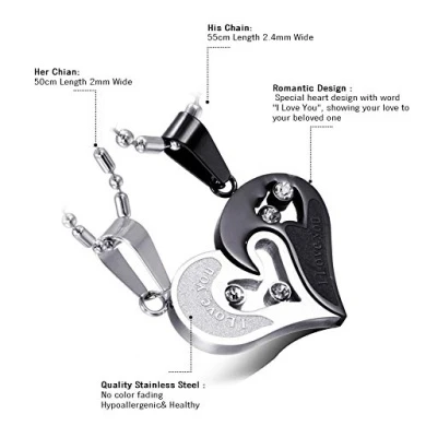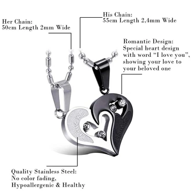 Cupimatch 2-Pieces Men Women Stainless Steel I Love You Heart Rhinestone Puzzle Matching Pendant Couple Necklace Christmas Valentine Gift With 50cm & 55cm Chain