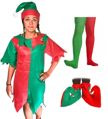 Ladies Adult Elf Costume Set with Hat, Elf Tights and Elf Shoe Covers. Green & Red Tunic has a Red Drawstring allowing you to Bring in the Outfit. Includes Stripe Elf Tights and Green & Red Shoe Covers to Complete the Outfit. Available in 3 Sizes: 8-10, 12-14, 16-18