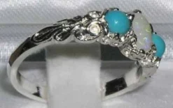 Ladies Solid Sterling Silver Natural Opal & Turquoise English Victorian Trilogy Ring – Finger Sizes L To Z Available – Ideal Gift For For Christmas, Birthday, Valentines Or Mothers Day