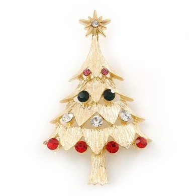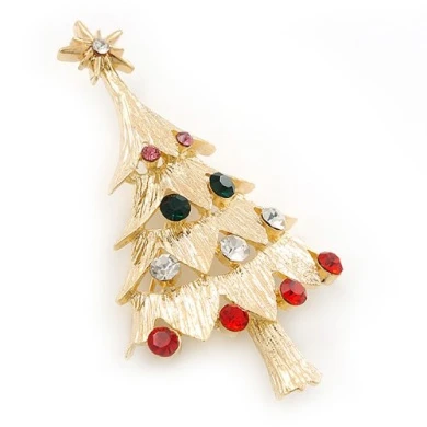 Red, Green, Clear, Pink Austrian Crystals Christmas Tree Brooch In Gold Plating – 60mm Length