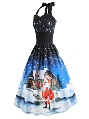 Toamen Womens Christmas Dress Vintage Sleeveless Xmas Santa Snowflake Elk Print Skater Swing Evening Party Dress Elegant A-line Dress