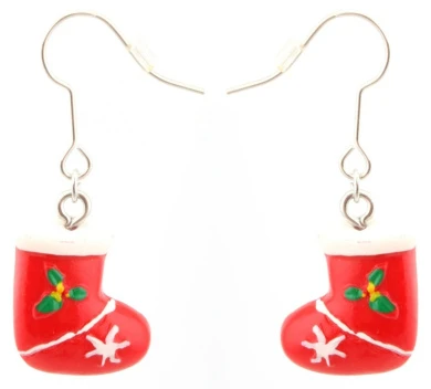 A pair of red stocking drop earrings with green holly and white snowflake decoration exclusive to Zest. With silver coloured fish hook fastening for pierced ears. A cute pair of earrings; a perfect addition to your christmas outfit! Stockings measure 2cm high x 1.5cm at the widest point. Not suitable for children under 3 years due to small parts. All items should be removed before sleep. Not recommended for new piercings. May not be colourfast. This is not a toy. Pierced earrings can only be returned if the clear bag they are packed in is still sealed